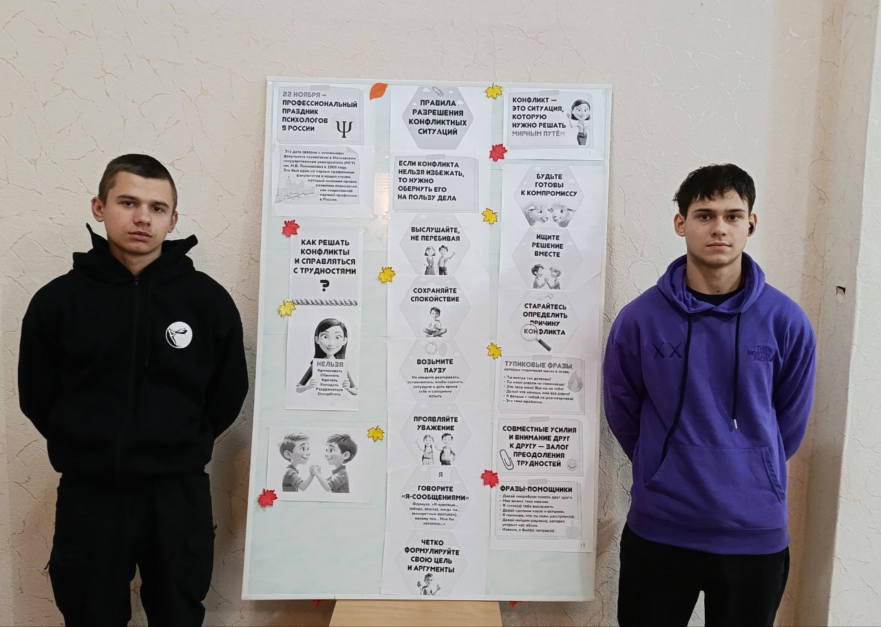 18.11.25 в рамках недели психологии с обучающимися I-III курсов было проведено тестирование «Конфликтный ли ты человек?». Больше половины тестируемых уходят от конфликтов и споров, решают проблемы конструктивно, 5 % процентов опрошенных показали результат "Конфликтная личность". Результаты тестирования будут учтены в психолого- педагогической воспитательной работе.