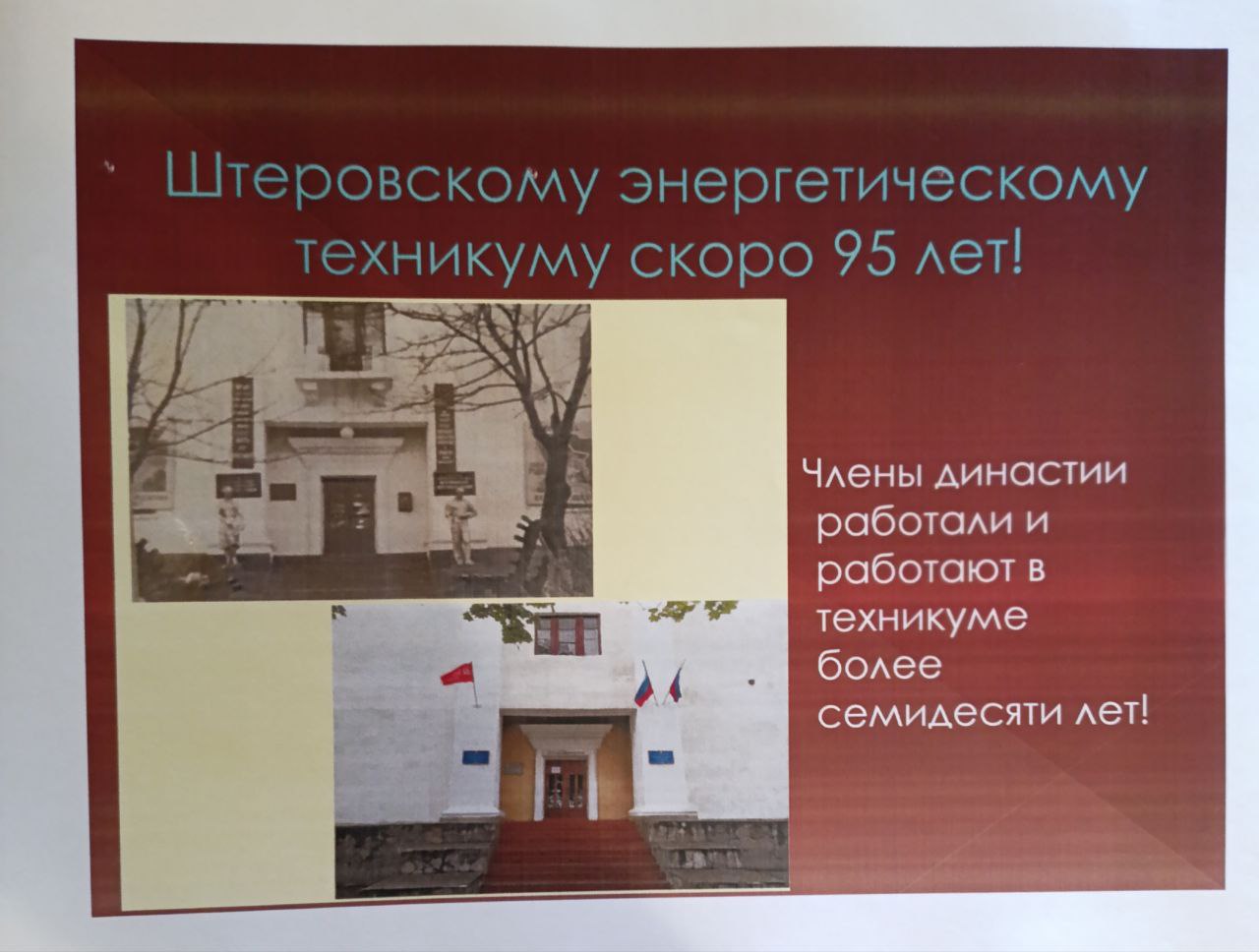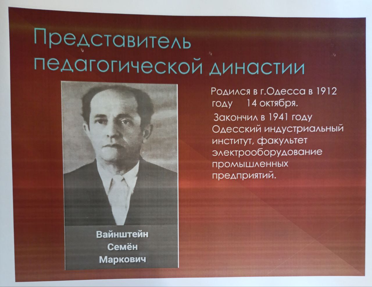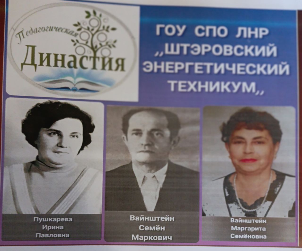 Древо " Педагогические ДИНАСТИИ" ГБОУ СПО ЛНР "Штэровский энергетический техникум". Накануне празднования знаменательной даты - 85-летия СПО - студенты познакомились с вкладом наших преподавателей в развитие техникума. Биография членов семьи Вайнштейн М.С. тесно связана с Штэровским энерготехникумом. Был собран материал о членах этой семьи- профессионалов, их вкладе в подготовку будущих энергетиков.